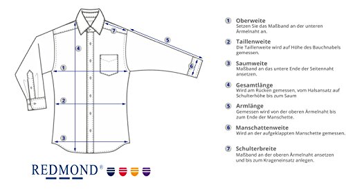 Redmond Office Hemden sind klassisch geschnitten und durch die gute Verarbeitung, aber auch den hervorragenden Preis, besonders für den Büroalltag geeignet. Der bequeme Popeline Stoff ist besonders bei längerem tragen angenehm auf der Haut. Unser Redmond Hemd Office hat folgende Merkmale: • Kent-Kragen • Langarm – normaler Arm (65 cm) • Klassische Schnittführung – Größe L (Kragenweite 41/42) Taillenweite = 122 cm • Abgerundete Kombimanschetten • Schlitzbesatz mit Knopf • Knöpfe über Kreuz angenäht für besonders festen Halt • 1 Tasche auf der Brust • Popeline Stoff aus 100% Baumwolle • Bügelfrei – non iron • waschbar bei 40 Grad • Redmond Artikelnummer: 150300 Die Verwendung kostbarer Rohstoffe in Verbindung mit modernster Fertigungstechnologie garantiert den permanent hohen Standard für höchste Ansprüche und Kundenzufriedenheit. Alle Redmond Produkte sind entsprechend Öko-Tex Standard 100 gefertigt.